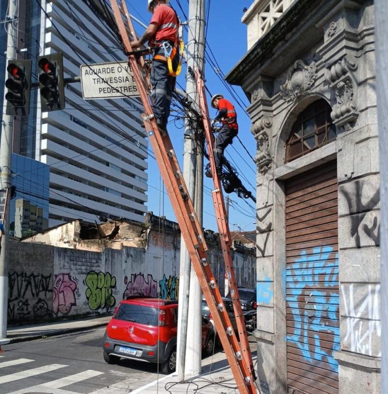 Onze empresas de telecomunicações atuaram nesta terça-feira (8) na retirada de cabos aéreos ou reorganização da fiação em 31 postes da Rua João Pessoa, entre a Constituição e a Senador Feijó, no Centro Histórico de Santos. A ação integra o Projeto de Reordenamento de Cabos, iniciado no dia 1º pela CPFL em parceria com a Prefeitura.