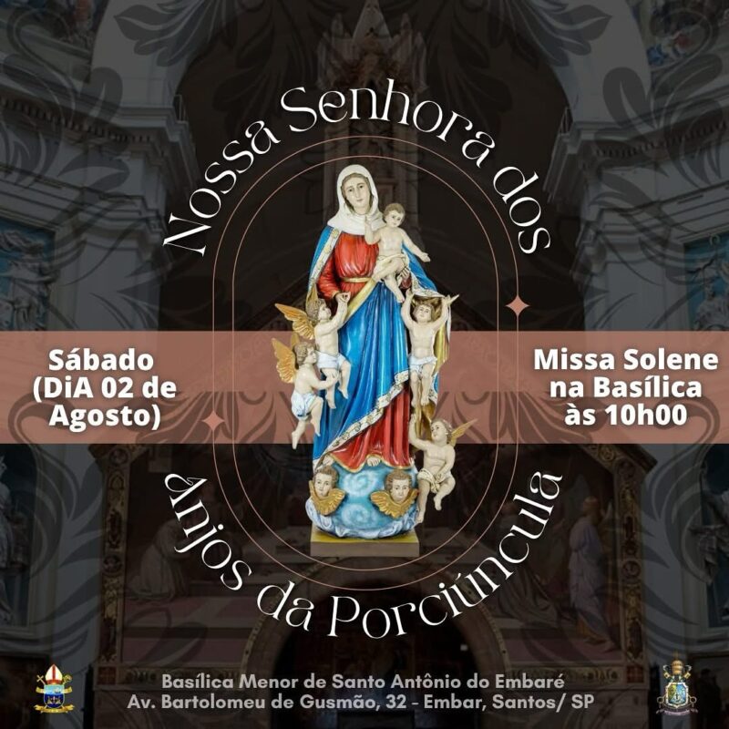 Em Santos, a Basílica Menor de Santo Antônio do Embaré convida os fiéis para a Missa Solene em honra a Nossa Senhora dos Anjos da Porciúncula, neste sábado, 2 de agosto, às 10h.
