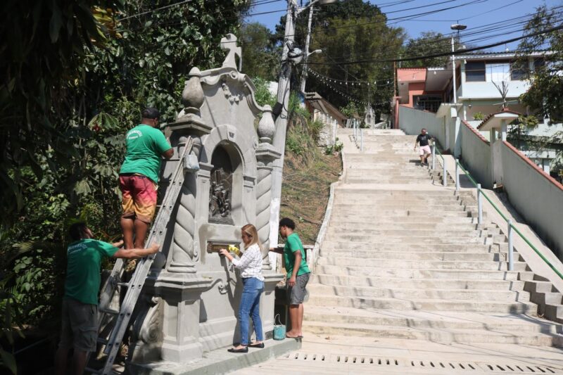 A Secretaria de Cultura de Santos iniciou a limpeza dos nichos na escadaria do Monte Serrat. O objetivo é preparar o local para a Festa de Nossa Senhora do Monte Serrat, padroeira da cidade, que começa na próxima semana.