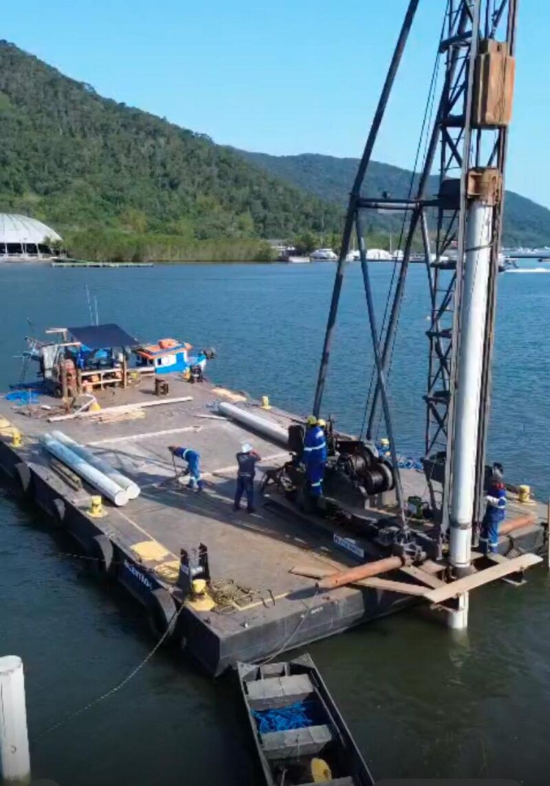 Sendo assim, trinta e cinco estacas foram cravadas no braço maior do Canal de Bertioga. E outras oito no braço menor, enquanto a área da fonte interativa recebeu 10 unidades.