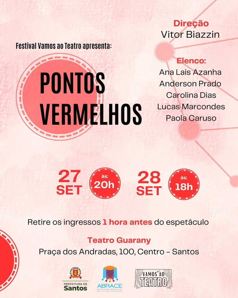 O espetáculo teatral “Pontos Vermelhos” estreia em Santos, nos dias 27 e 28 de setembro, no Teatro Guarany.