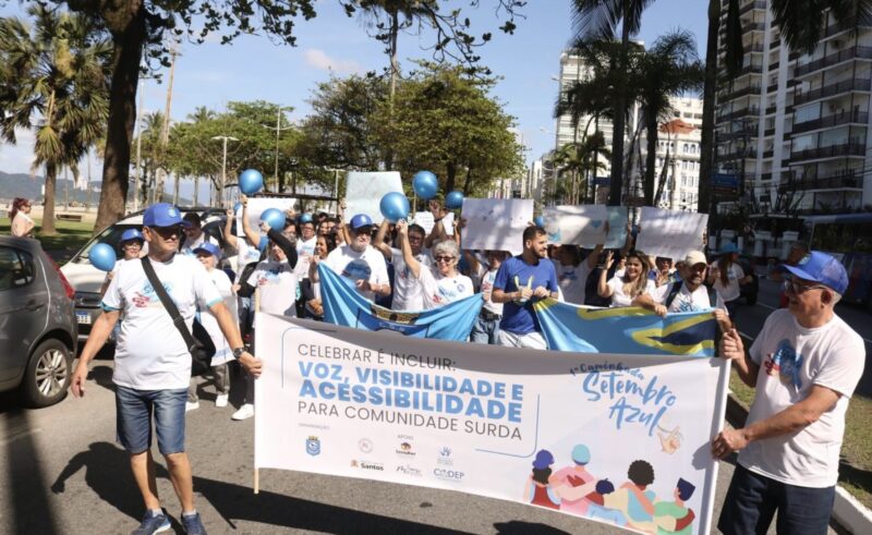 A orla de Santos ganhou tons de azul na manhã ensolarada deste sábado (27) com a inédita Caminhada da Pessoa Surda e do Intérprete de Libras – Setembro Azul. O ato saiu da Praça das Bandeiras e seguiu até a Concha Acústica, no Gonzaga, reunindo centenas de participantes. O objetivo foi valorizar a cultura surda, defender direitos e ampliar a inclusão social.