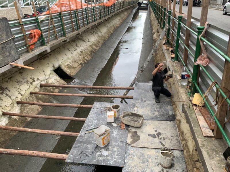 Assim como, na sequência, serão aplicados epóxi e pintura impermeabilizante na laje e na viga.