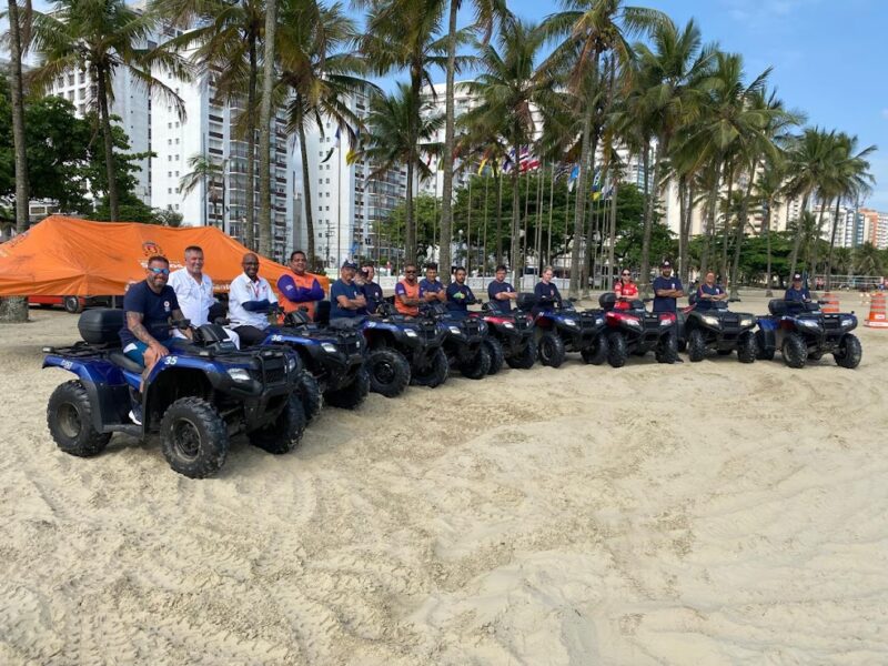 Profissionais do Serviço de Atendimento Móvel de Urgência (Samu) de Santos participaram, na quarta-feira (5), de um treinamento de pilotagem de quadriciclos voltado ao atendimento em trechos de areia durante o verão. A capacitação aconteceu em uma área isolada em frente à Praça das Bandeiras, no Gonzaga.
