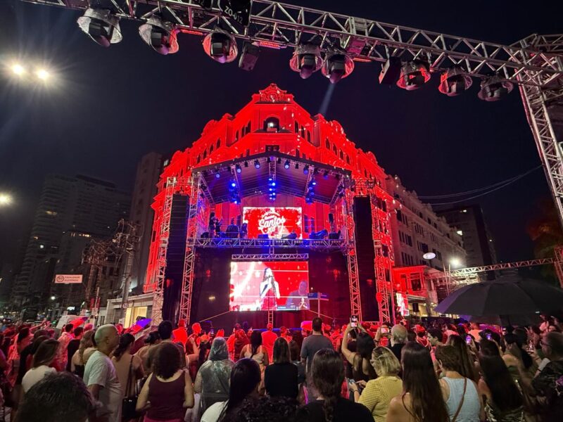 O ponto alto da noite foi o show de Gabi Melim. Em carreira solo, a cantora emocionou o público ao interpretar músicas marcantes de sua trajetória e sucessos do período em que integrou a banda Melim. “Cantar em Santos, em um show aberto para todos, tem tudo a ver com o espírito do Natal”, afirmou a artista.