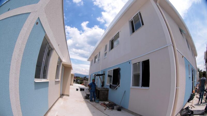 Em todos os prédios e casas, já houve a montagem dos módulos de parede e assoalho, cobertura, distribuições elétrica e hidráulica, contrapiso, placas de gesso nas paredes e nos tetos, passagem dos cabos de entrada até os medidores e pintura externa.