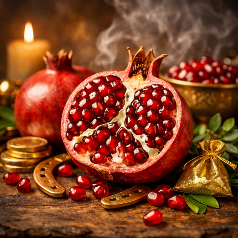Por fim, a romã simboliza riqueza, multiplicação e proteção. Suas sementes simbolizam prosperidade, sendo comum o hábito de guardar alguns grãos para atrair dinheiro e boas energias durante o ano.