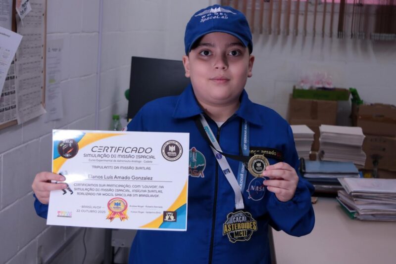 Elanos já acumula certificados e experiências em projetos ligados às ciências espaciais. As oportunidades surgiram de forma gradual, impulsionadas pelo interesse do aluno e pelo apoio da família.