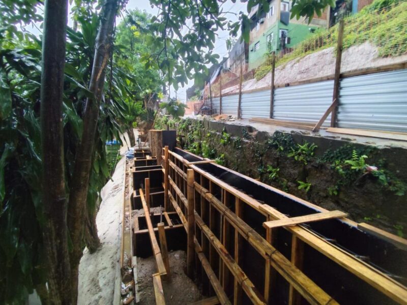 Após a concretagem, a obra segue para a fase final, com a construção da sarjeta e a execução dos acabamentos. Essa etapa vai assegurar a estabilidade global e local dos taludes e das estruturas de contenção.