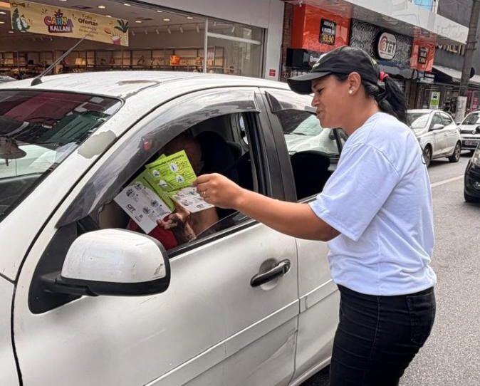 Durante as ações, equipes da CET-Santos orientam condutores e entregam folhetos com informações sobre como agir em locais com faixa de pedestres sem semáforo. Ao fixar o selo no veículo, o motorista demonstra adesão ao movimento em favor da segurança viária.
