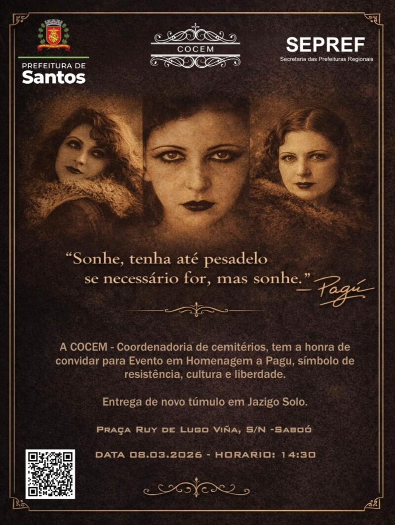 A Coordenadoria de Cemitérios (COCEM), ligada à Secretaria das Prefeituras Regionais (SEPREF) da Prefeitura de Santos, promove no dia 8 de março, às 14h30, uma homenagem a Pagu, símbolo de resistência, cultura e liberdade.