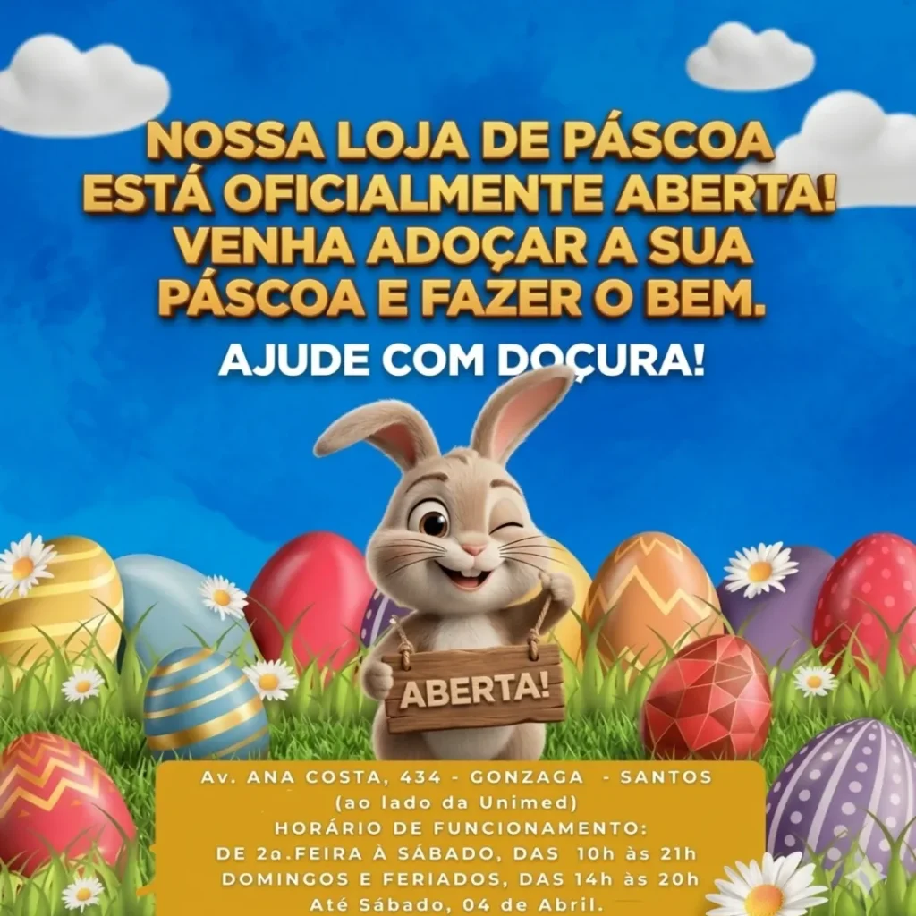 A chegada da Páscoa também pode ser um momento de solidariedade em Santos. O Lar Espírita Mensageiros da Luz abriu sua tradicional Loja de Páscoa, com a venda de ovos de chocolate, bombons, pelúcias e cestas presenteáveis de marcas conhecidas. Toda a renda arrecadada será destinada à manutenção das atividades da instituição.