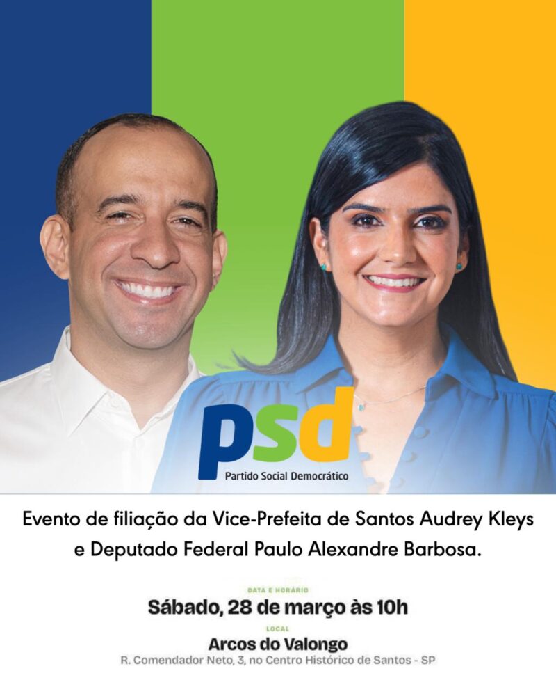 A vice-prefeita de Santos e atual secretária de Educação, Audrey Kleys, oficializa sua filiação ao Partido Social Democrático (PSD) neste sábado, 28 de março. O evento acontece às 10h, nos Arcos do Valongo, no Centro Histórico de Santos.