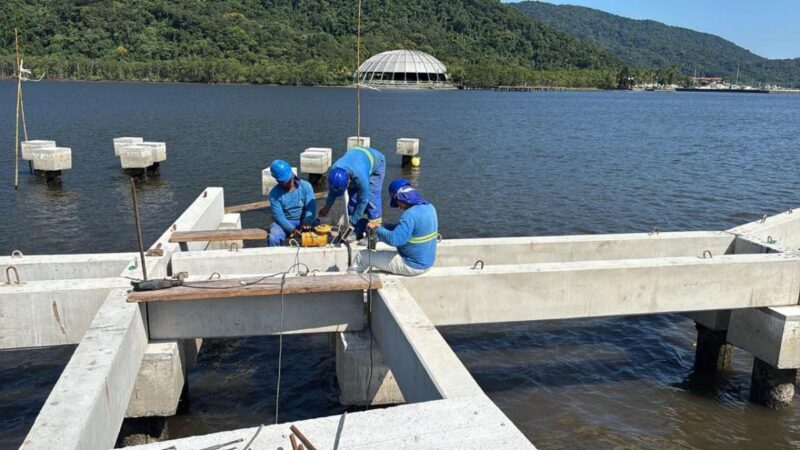 A Prefeitura finalizou nesta segunda-feira (30) a instalação das vigas do segundo píer no Canal de Bertioga, etapa importante da reurbanização do Portinho Caruara. As equipes também concluíram a estrutura do deck principal e iniciarão a colocação das lajes nos próximos dias.