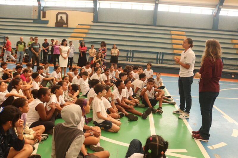 Depois da conversa, os alunos participaram de atividades esportivas e dinâmicas interativas. Em seguida, uma clínica de futsal com a equipe feminina da Fundação Pró-Esportes de Santos (Fupes) ampliou a experiência prática. Assim, o encontro combinou teoria e ação de forma leve e envolvente.