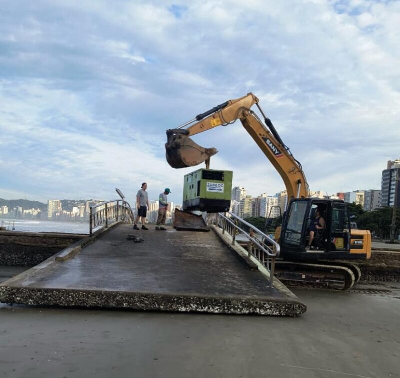 Na manhã desta quinta-feira, equipes retiraram o gerador, último equipamento que permanecia na passarela. Antes, a maré alta dificultou a operação e impediu o acesso de máquinas ao local.